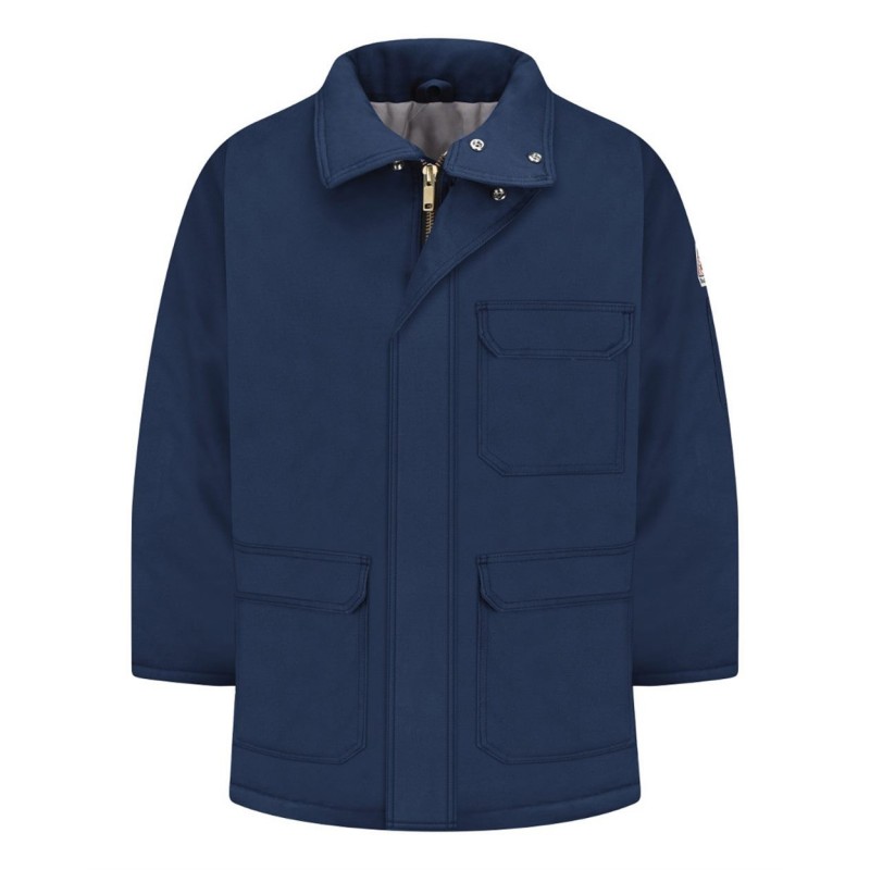 - Two-way, separating, heavy-duty Nomex, taped brass zipper, fully covered with insulated storm flap, concealed snap closure