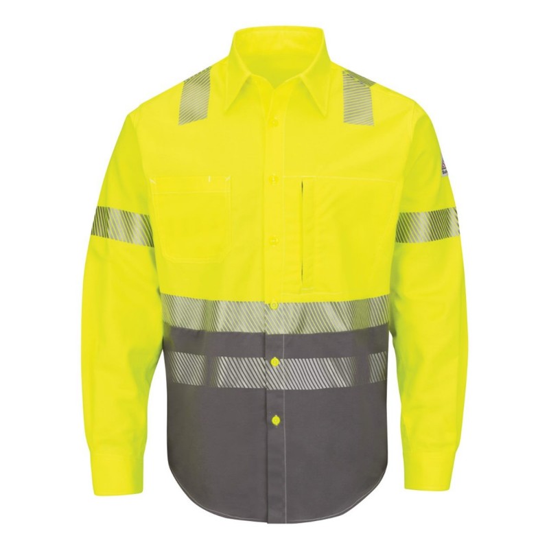 - Color blocked shirt with hi vis upper half for ANSI compliance and grey lower half to conceal dirt and stains